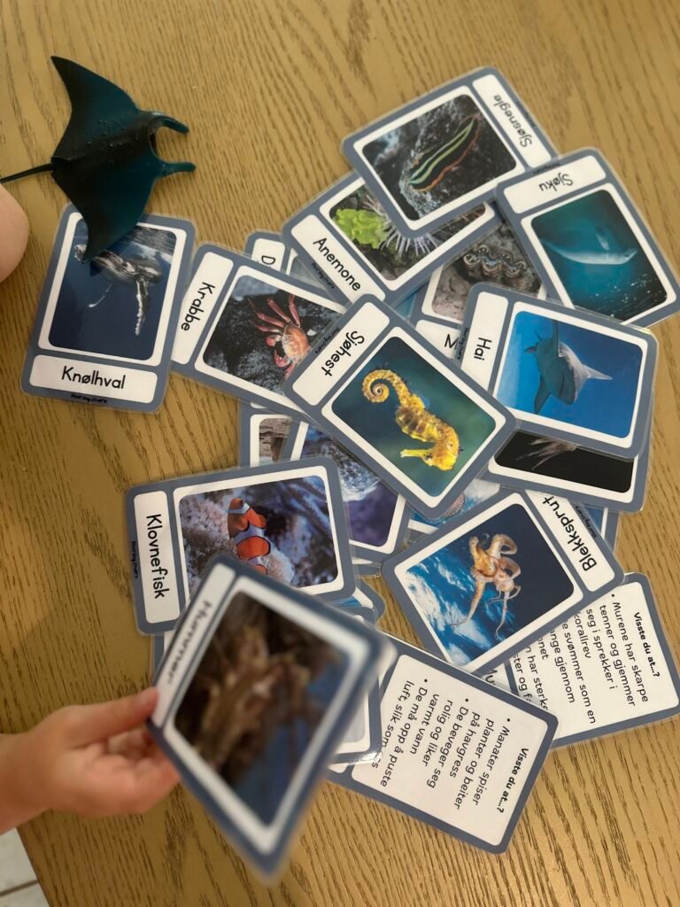 Vi liker spesielt godt å bruke fotsporkortene ute i naturen, hvor vi leter etter spor i snø eller jord eller inne sammen med lekeleire og små dyr. Havdyrene passer perfekt til vannlek, sansebord eller rolige stunder med bøker og samtaler 🌊🐠