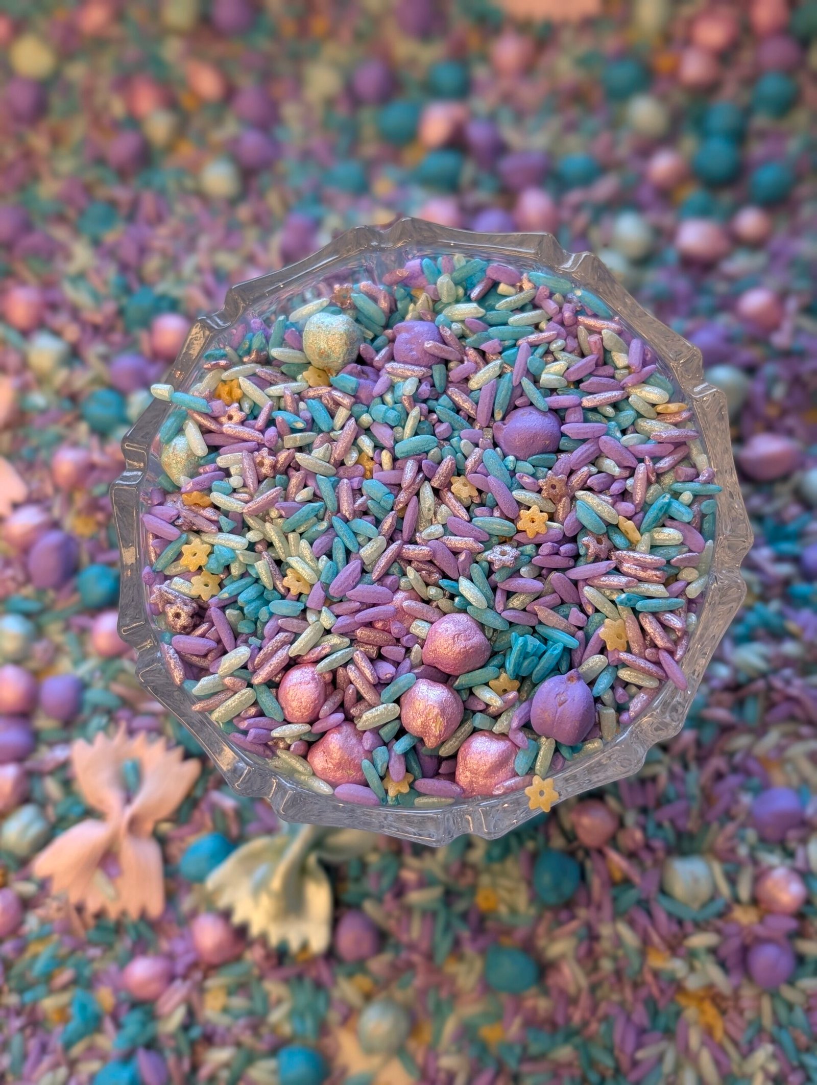 Tips til bruk: Fantasibasen passer fint sammen med enhjørningfigurer, små skåler, skatter, glitrende elementer eller andre løse deler – og kan brukes både hjemme og i barnehage for å skape inviterende og fantasifull lek.