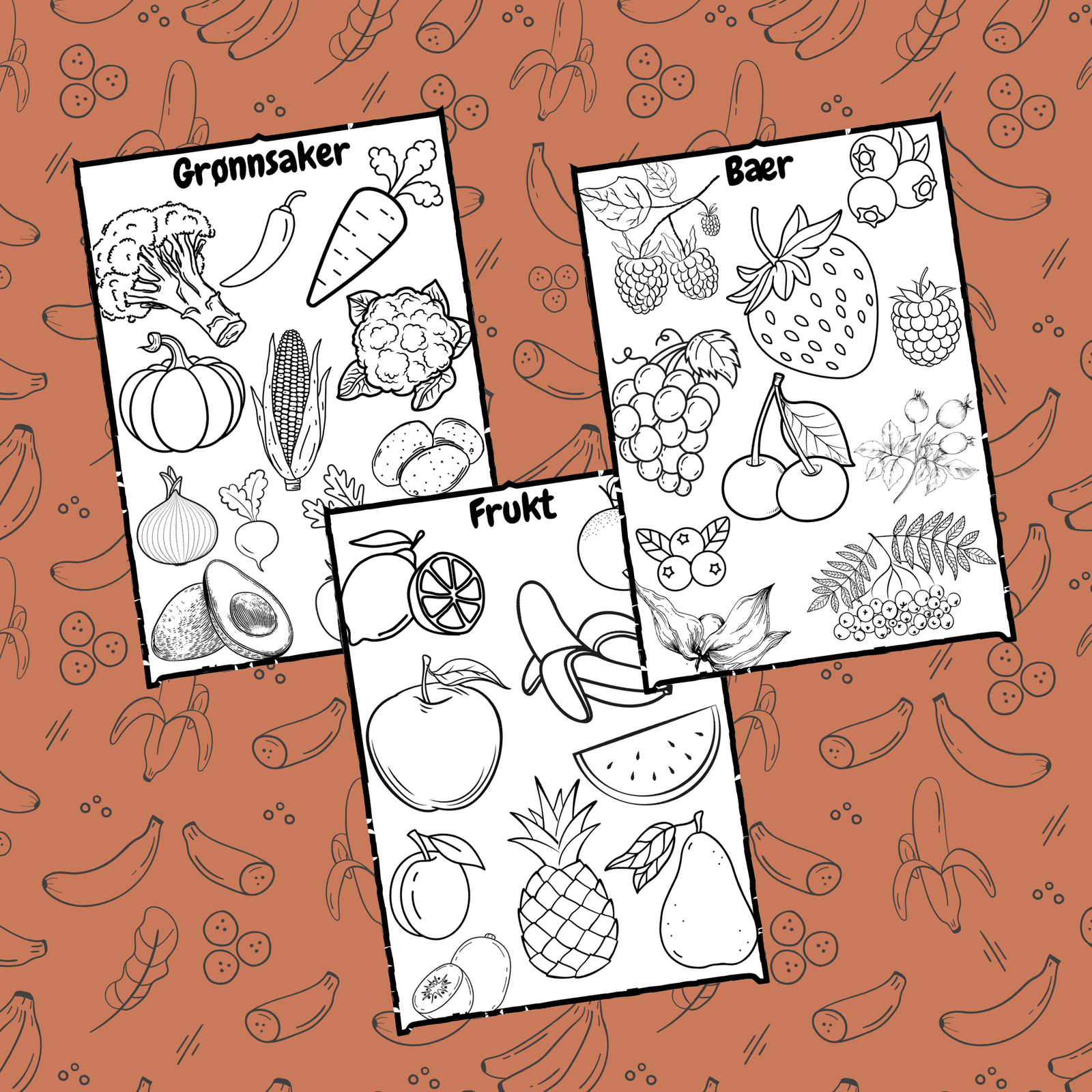 – Ulike fargeleggingsark med frukt, bær og grønnsaker