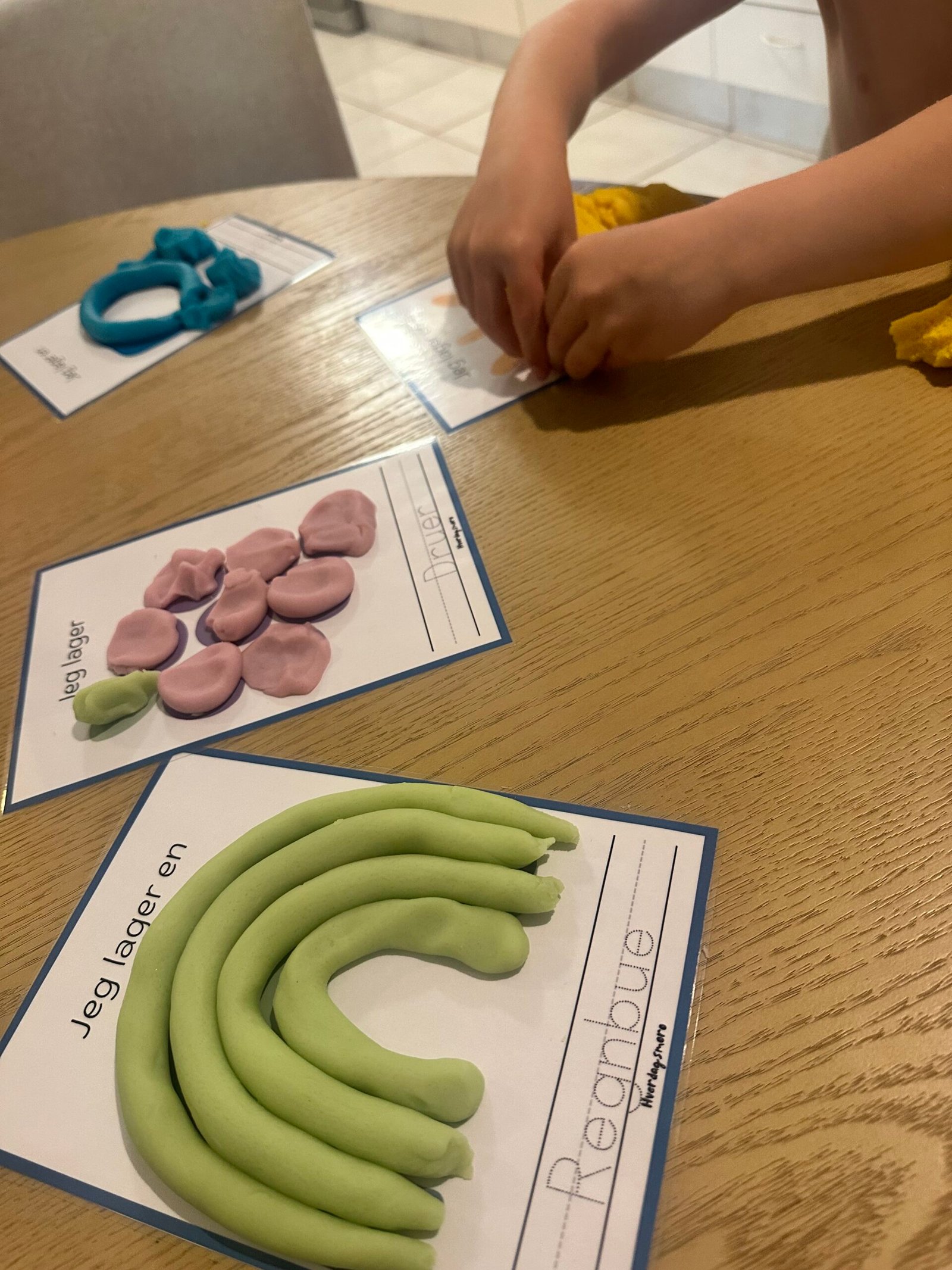 • Fargekodede lekeleirekort der barnet bygger figurer med leire
