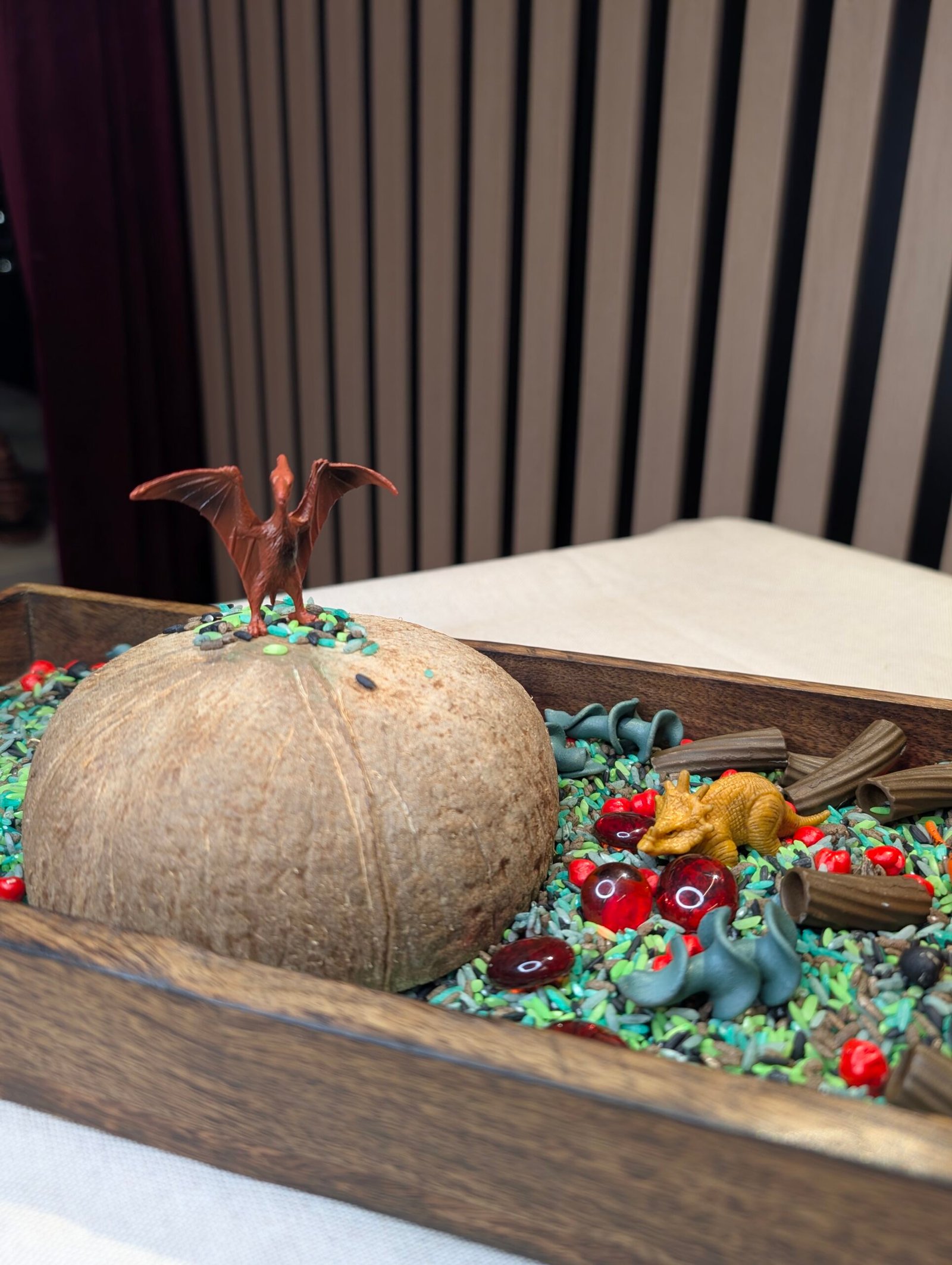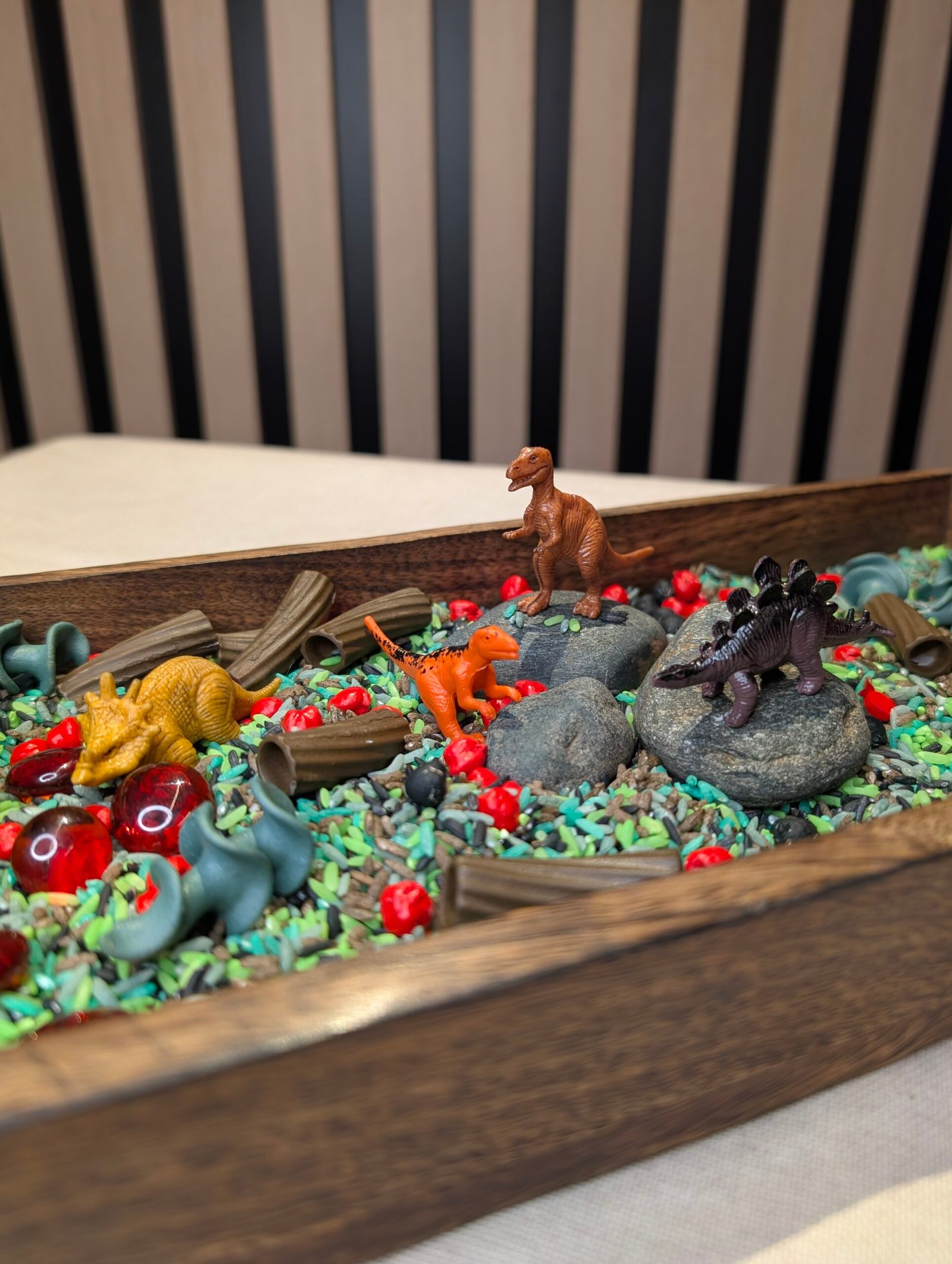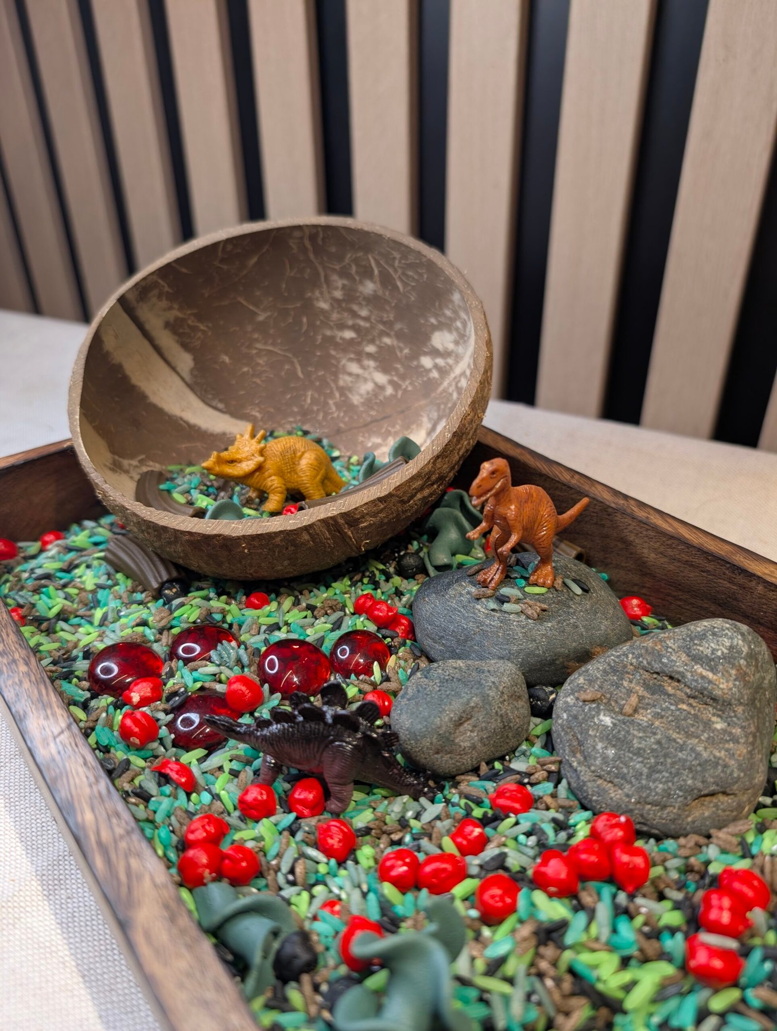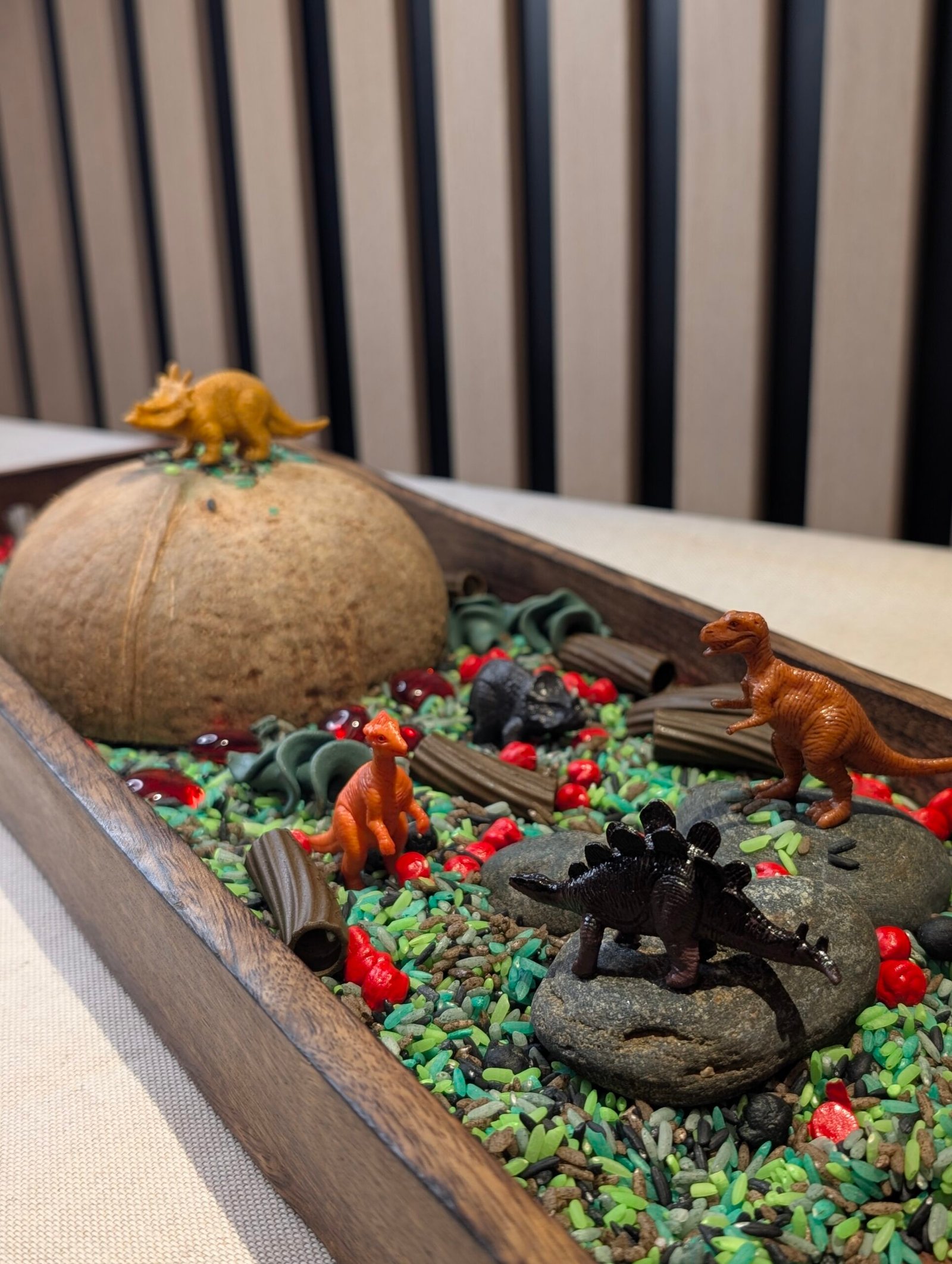 Utforsk en liten dinosaurverden med sanselige materialer og fem små dinosaurfigurer 🦖 Perfekt for åpen lek, fordypning og rolige stunder hjemme eller i barnehagen.