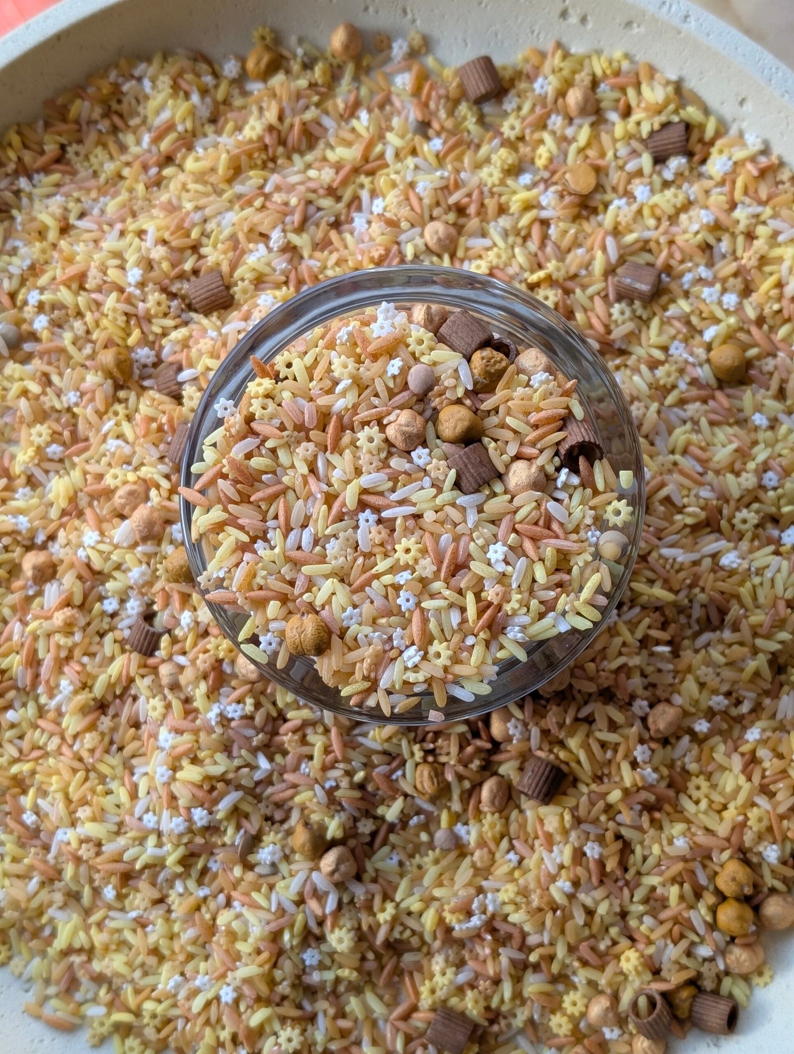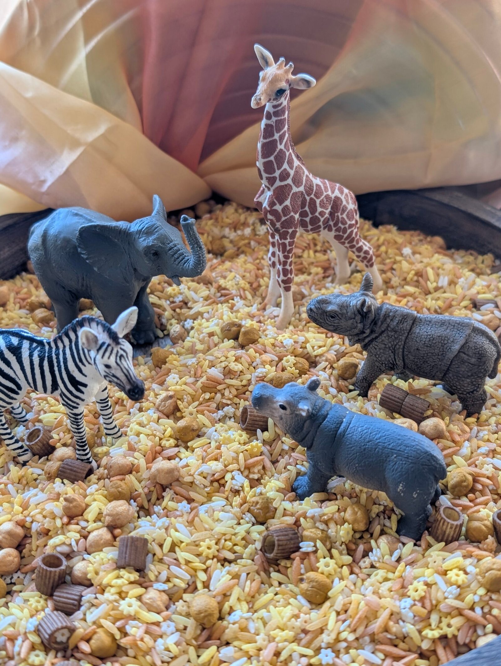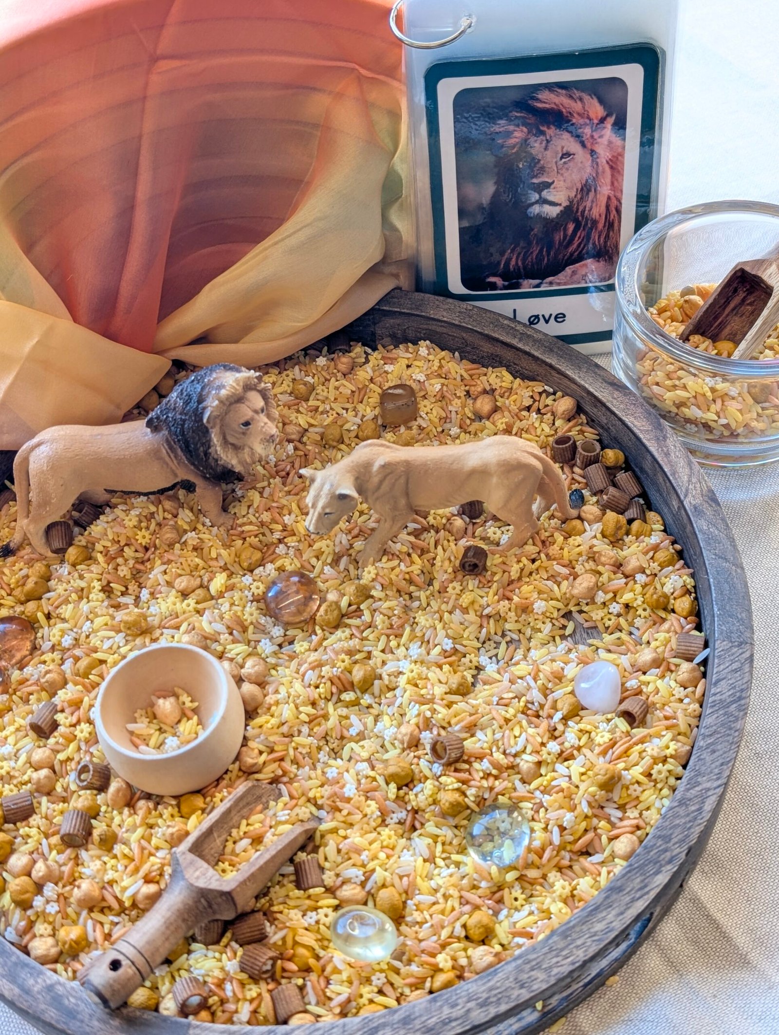 Denne sanselige basen i myke ørkentoner er laget for å inspirere til åpen lek der barna kan grave, helle, flytte og skape sine egne små landskap enten med savannedyr, naturmaterialer eller andre små figurer.