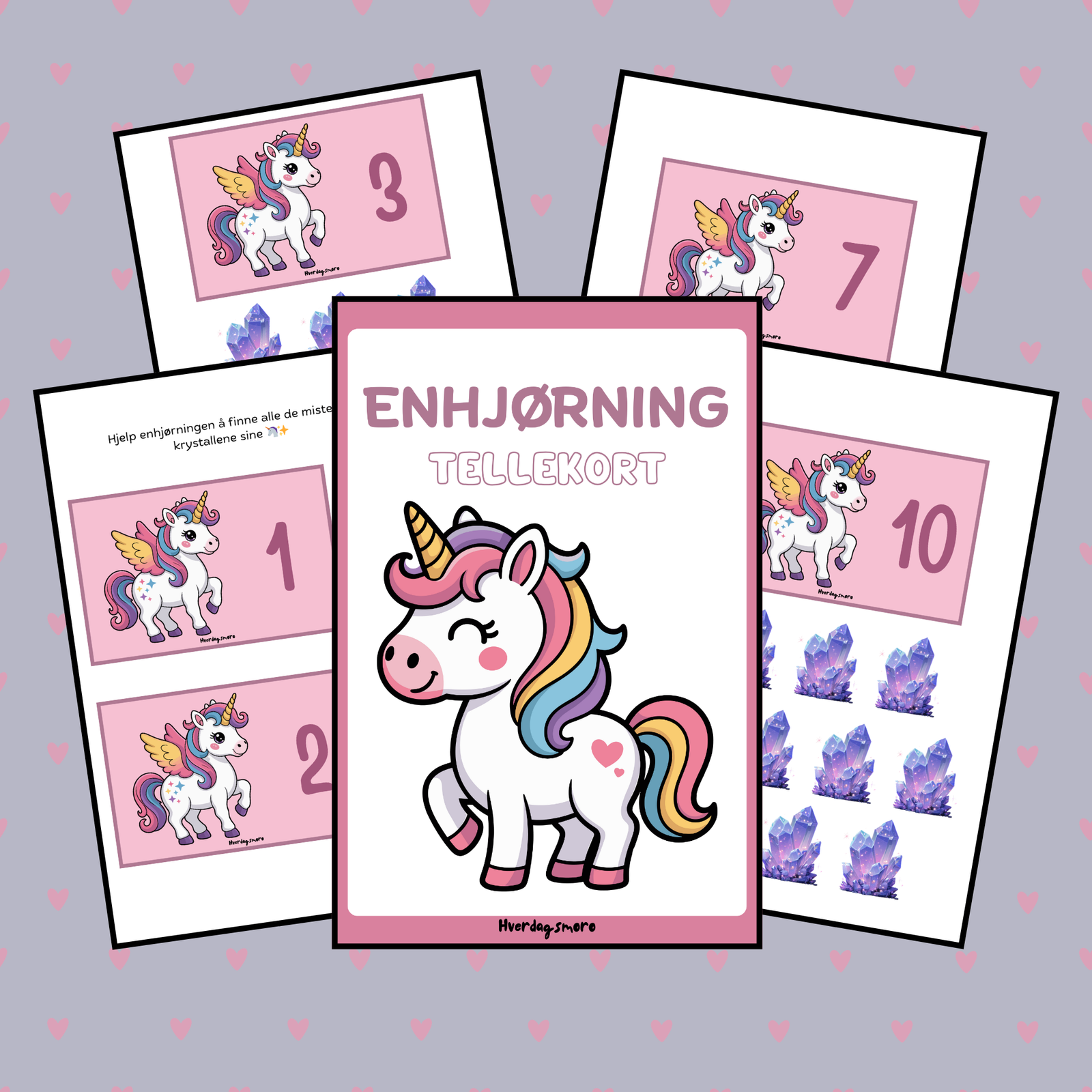 Gjør tallforståelse magisk og lekent med våre digitale enhjørning-tellekort! Dette pedagogiske settet er utviklet for å støtte barns tidlige matematikkforståelse gjennom visuelle, tydelige og stemningsfulle oppgaver.