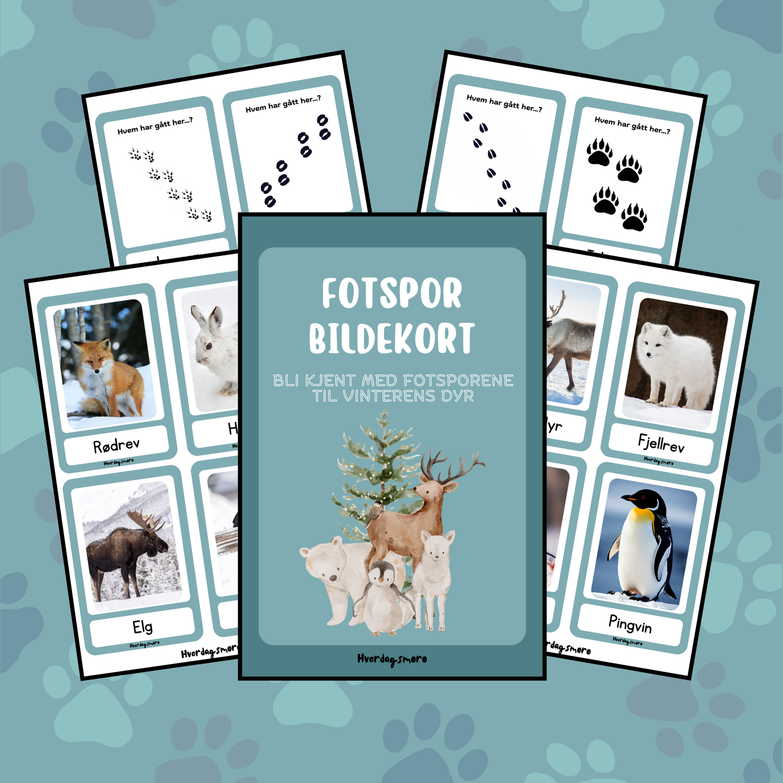 - 16 bildekort med vinterdyr og fotspor
