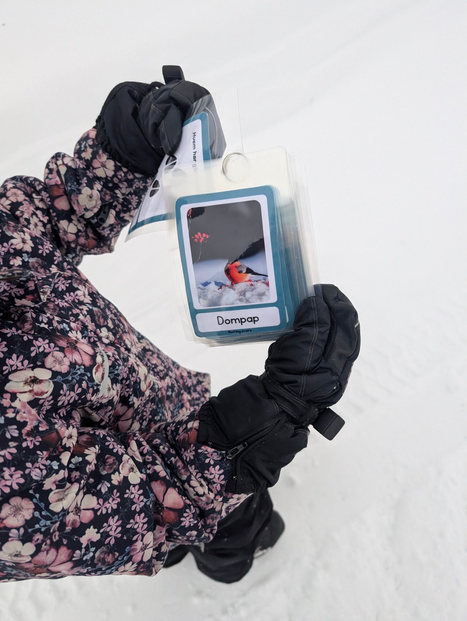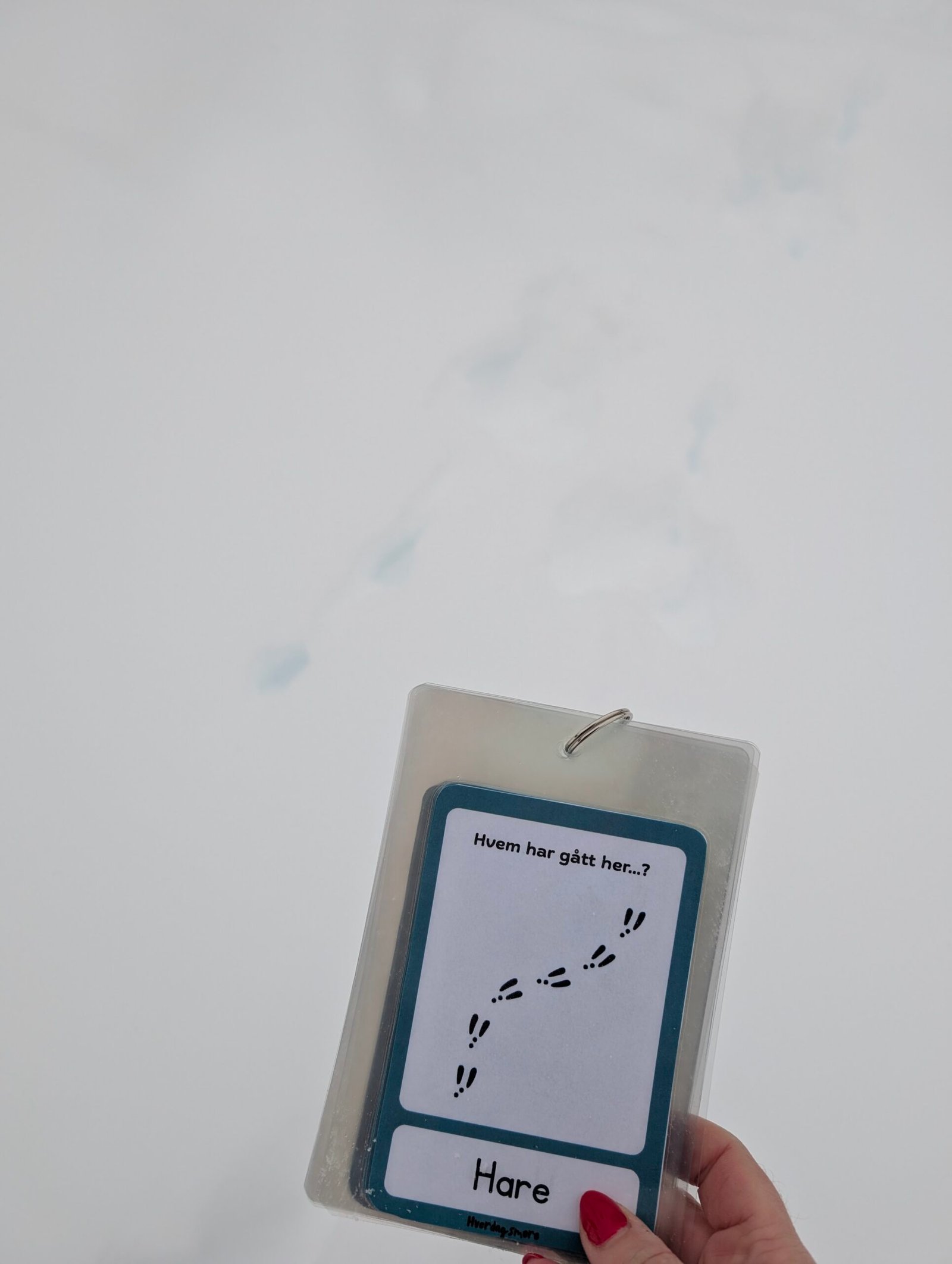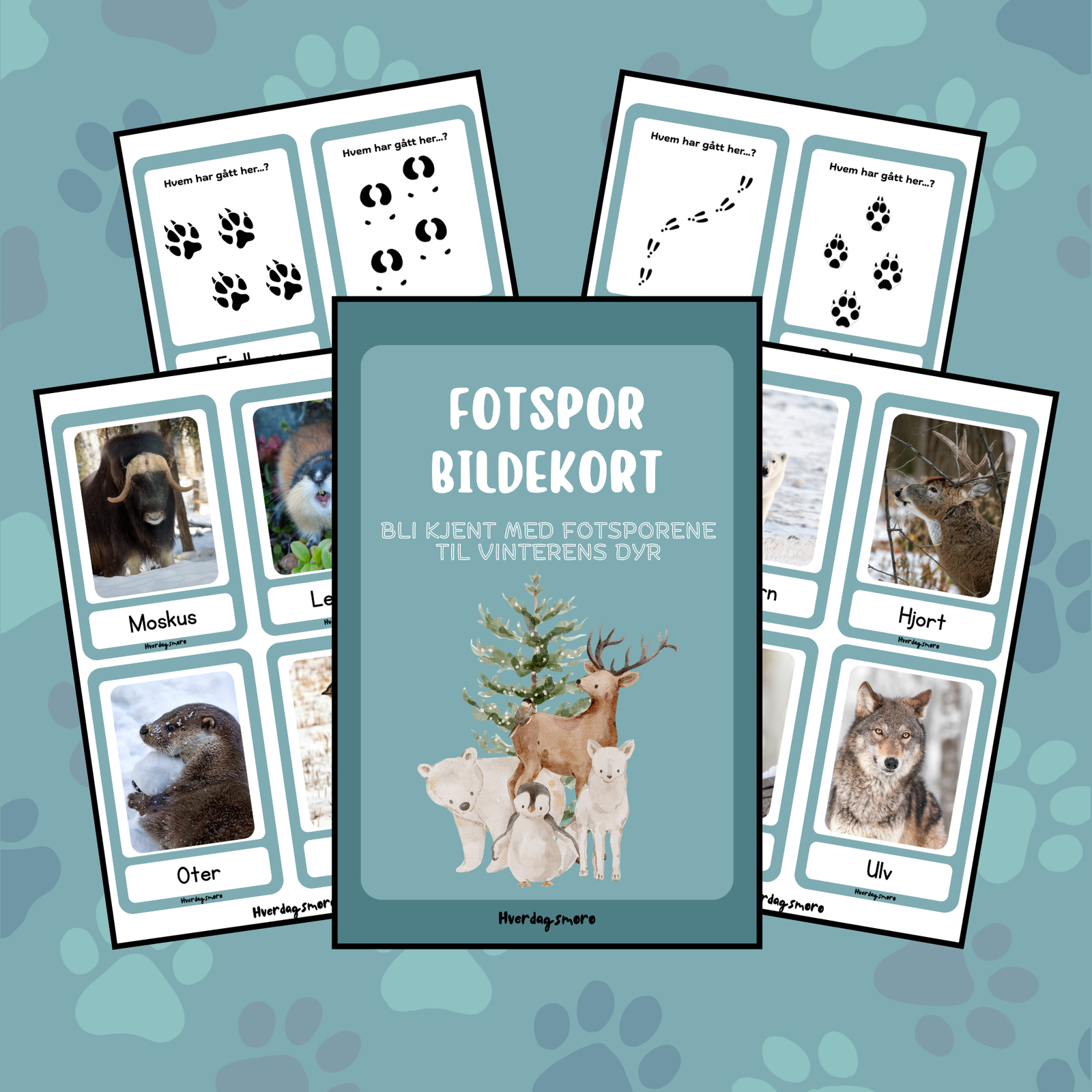 Dette pedagogiske settet inneholder 16 bildekort med realistiske bilder av vinterdyr, og forenklede fotspor på baksiden av hvert kort – hvem har gått her?